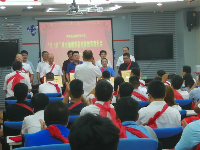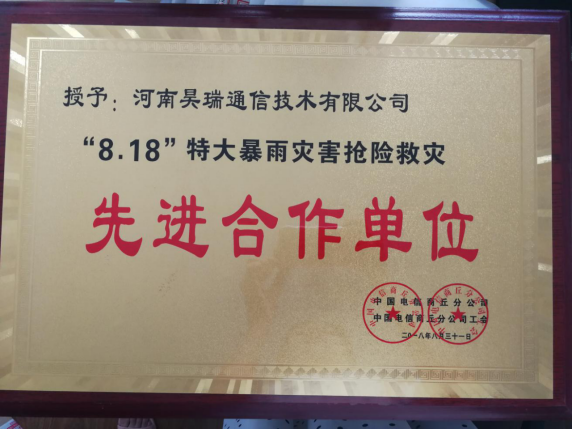 2018年8月31日,我公司领导受邀出席中国电信商丘分公司“8.18”特大暴雨灾害抢险救灾表彰会,会上中国电信商丘分公司充分肯定了我公司在这次救灾中的付出与贡献,并授予我公司“先进合作单位”荣誉称号。
